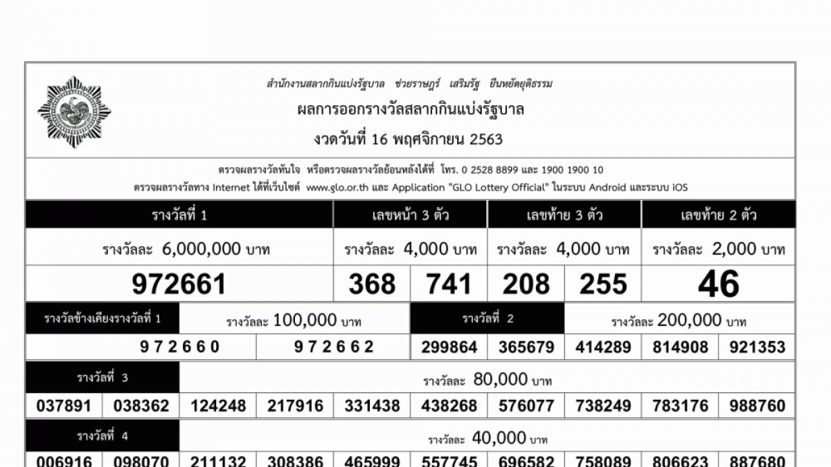 ตรวจหวย งวด 16 พฤศจิกายน 2563.