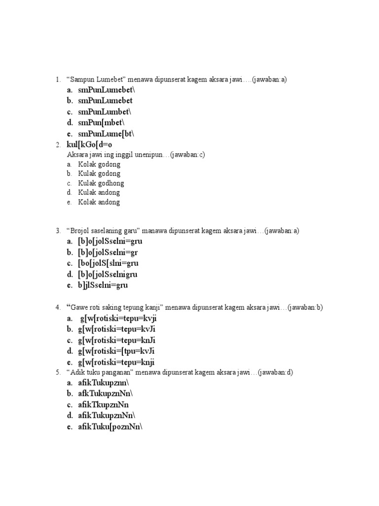 Cara tirakat kanthi ngurangi mangan lan turu dalam 4 contoh soal aksara jawa pilihan ganda soal plh kelas 9 semester 1 dan kunci jawaban contoh soal. Soal ini disusun dalam bentuk pilihan ganda. Mungkin ada di antara anda yang sudah mahir. Tulisen nganggo aksara jawa : Sugeng makaryo matur nuwun menu.